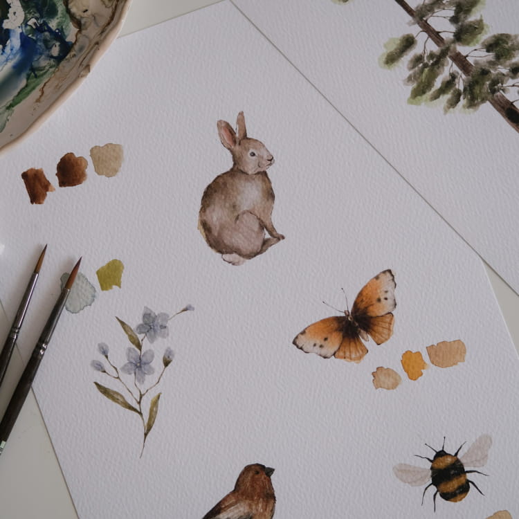 Minimalistyczne ilustracje, ręcznie malowane akwarelą, nawiązują do estetyki dawnych książek dziecięcych – spokojnej, naturalnej i pozbawionej nadmiaru bodźców. Tworzą przestrzeń sprzyjającą skupieniu, wyciszeniu i uważnemu oglądaniu.