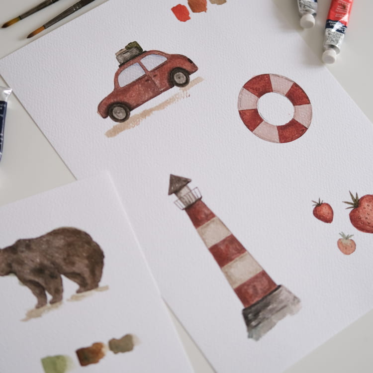 - ilustracje ręcznie malowane akwarelą